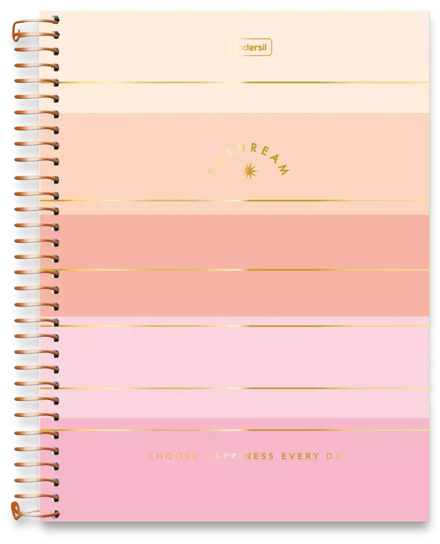 Hot Stamping dourado, Bolsa portfólio, cartela de adesivos, editorial, divisórias de matérias, calendário 2 anos, folha pontilhada e quadriculada, planejamento anual, planejamento mensal, folhas pautadas com microsserrilhas e espiral dourado.